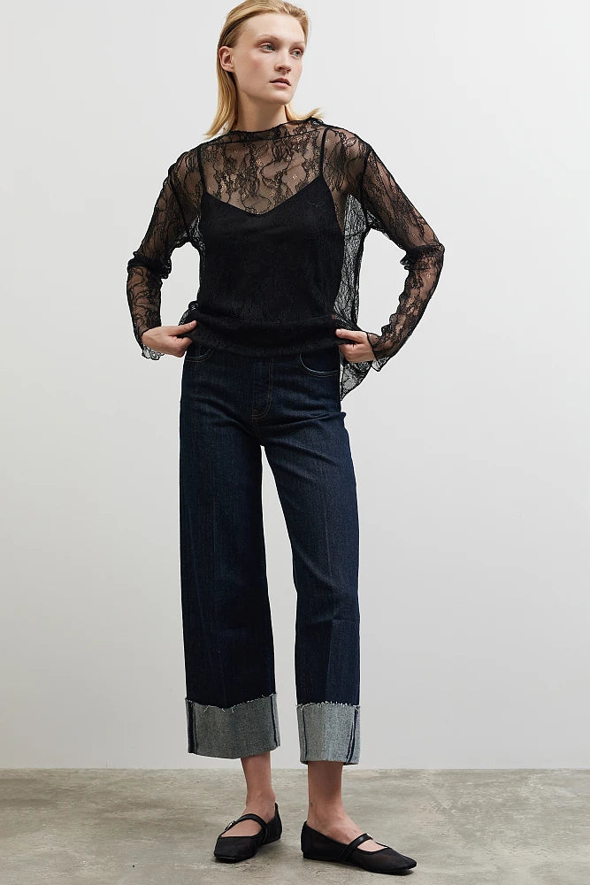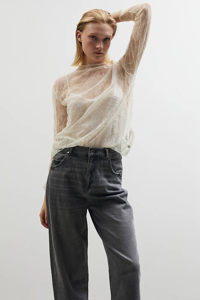 Chemisier à manches longues, encolure droite, avec dentelle, transparent, coupe régulière