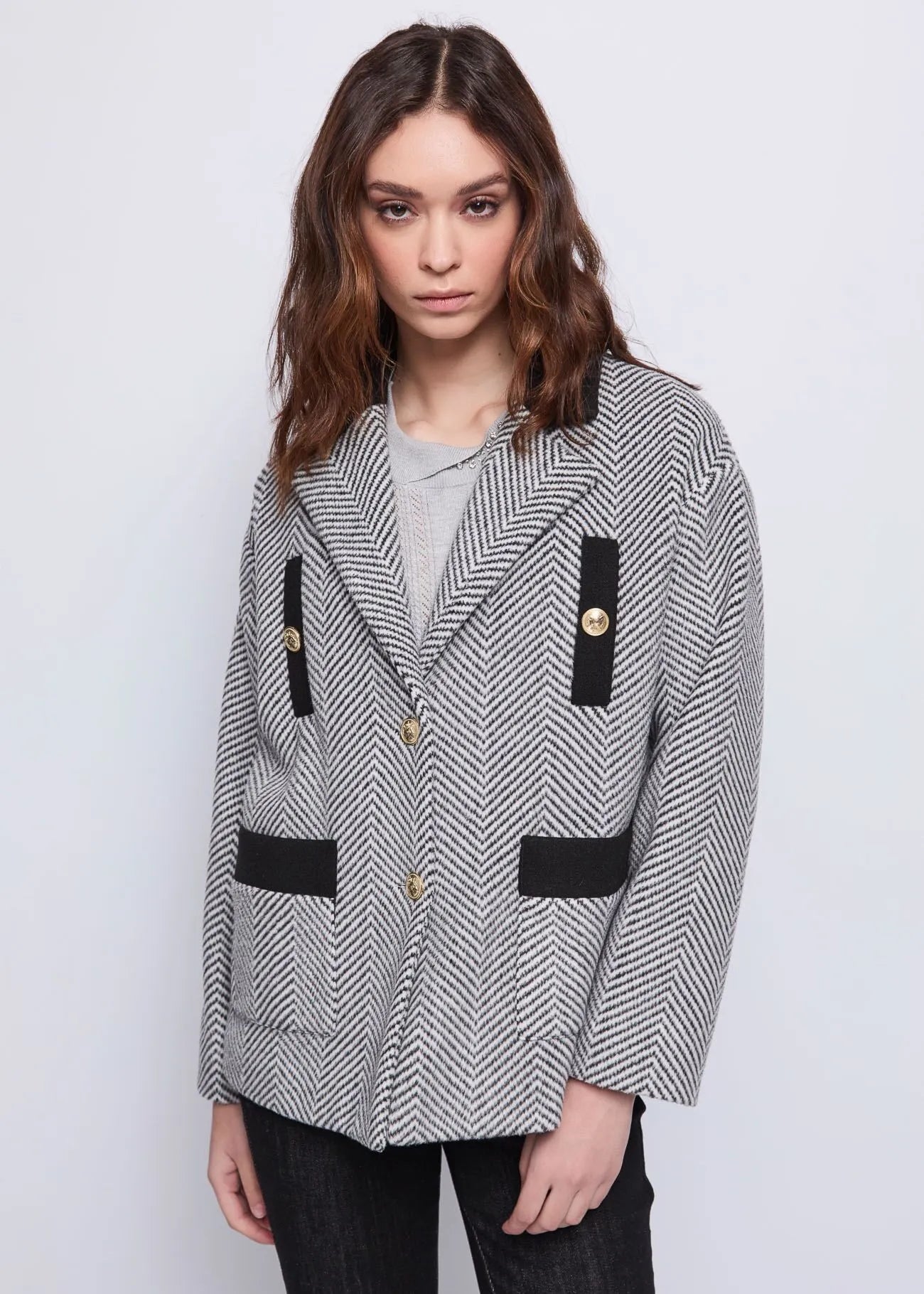 Optez pour la veste en viscose mélangée à chevrons, avec détails contrastés et boutons dorés. Parfaite pour un look raffiné et contemporain.