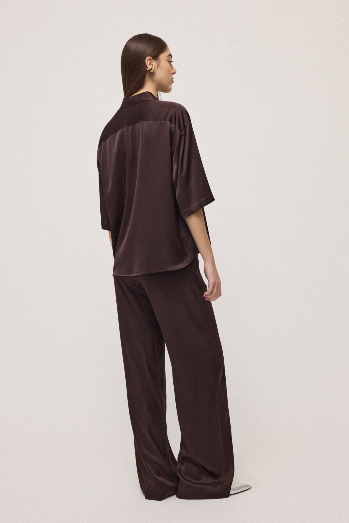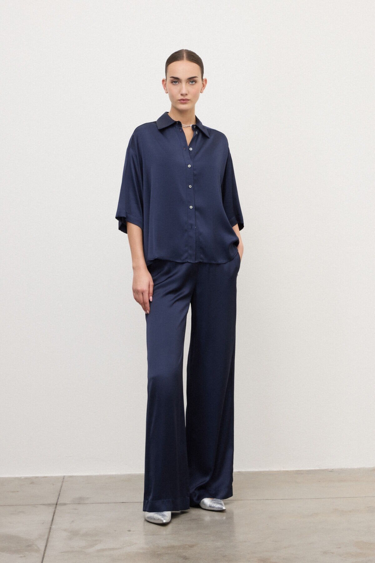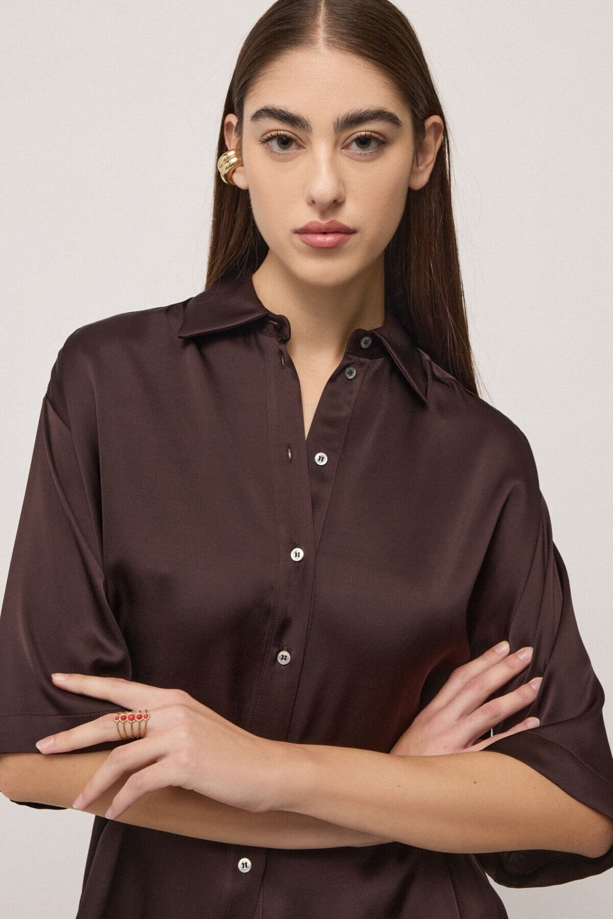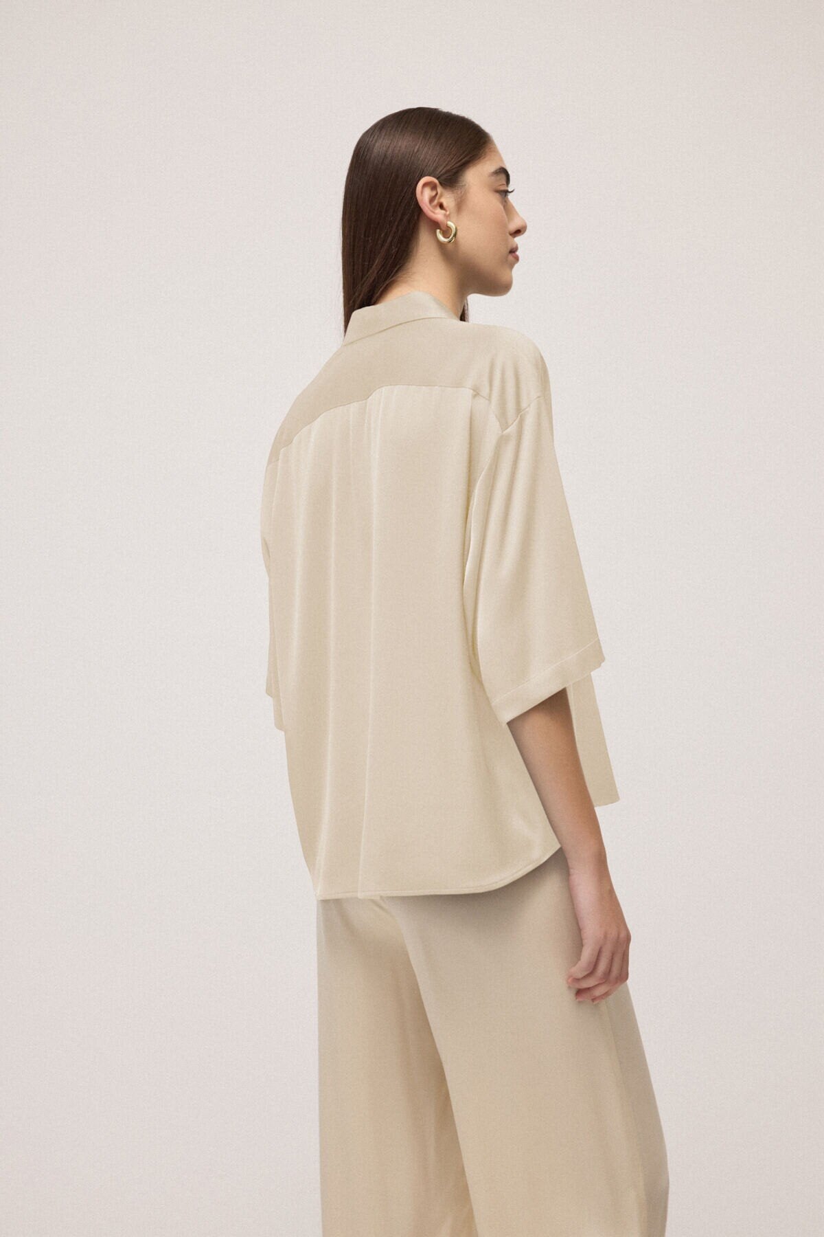 Chemise courte en satin 100 % viscose, manches 3/4 et coupe fluide. Un style frais et décontracté, idéal pour des looks à la fois relax et raffinés