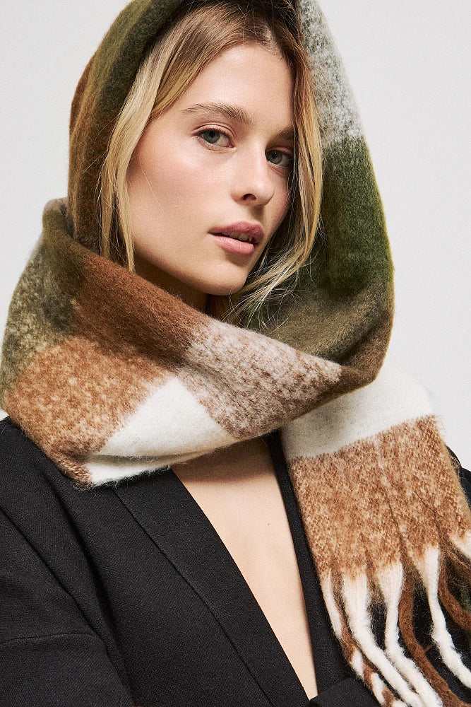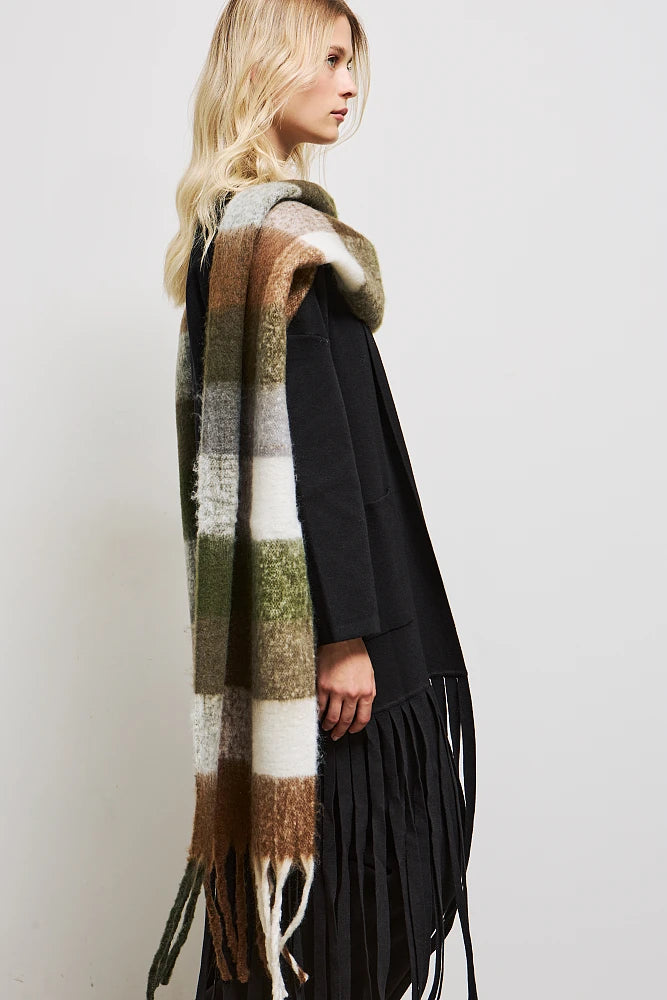 Écharpe épaisse en tissu élastique avec franges.