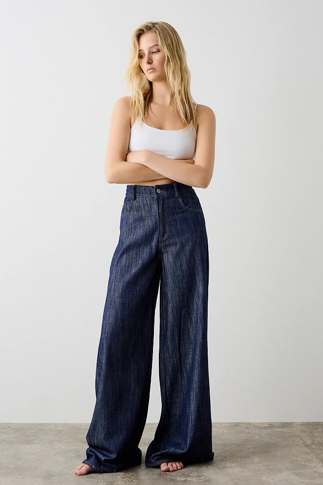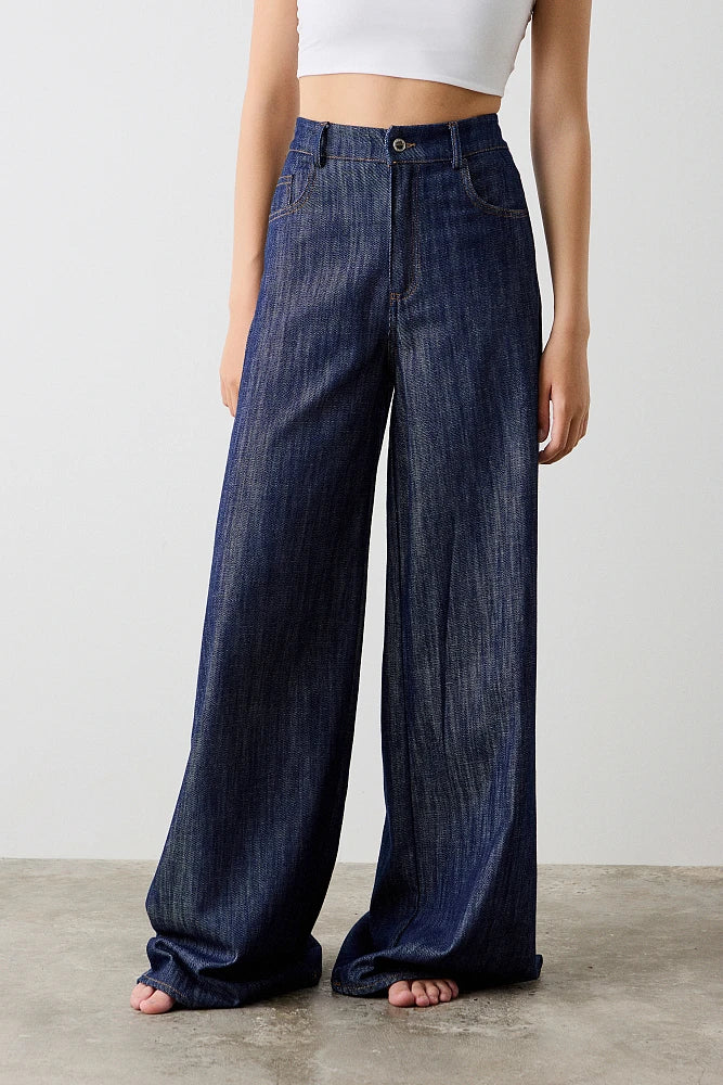 Jean Florence, fermeture zippée et boutonnée, avec poches, taille haute, jambe large