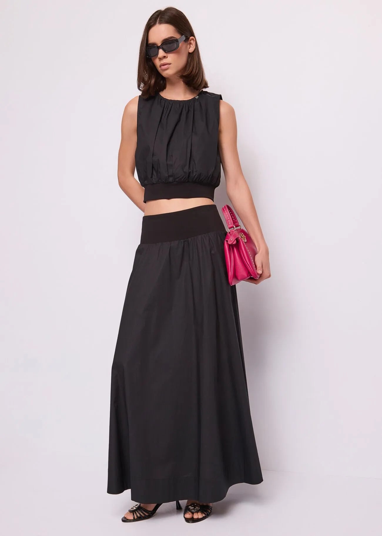 Associé au top assorti, ce modèle crée un look total black moderne et raffiné au charme minimaliste. Le sac à poignées avec coutures contrastées et les sandales griffées complètent la tenue