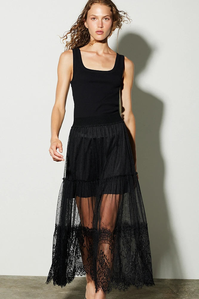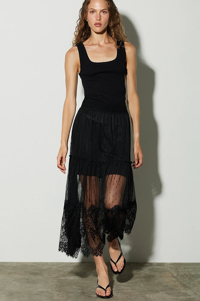 Jupe longue, avec taille élastiquée, avec tulle, avec dentelle, avec doublure intérieure, coupe régulière