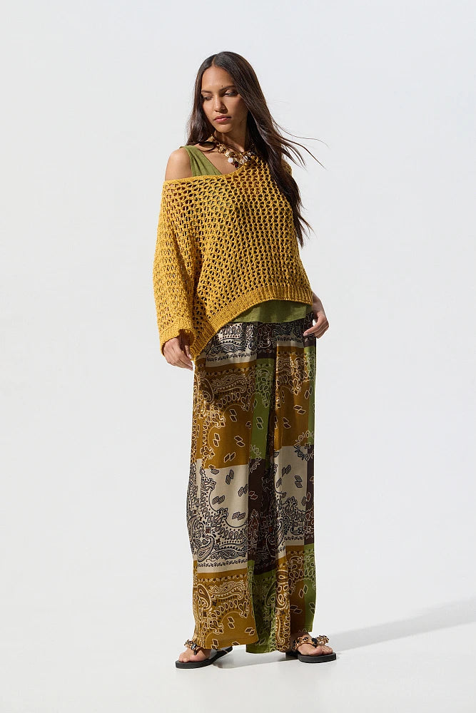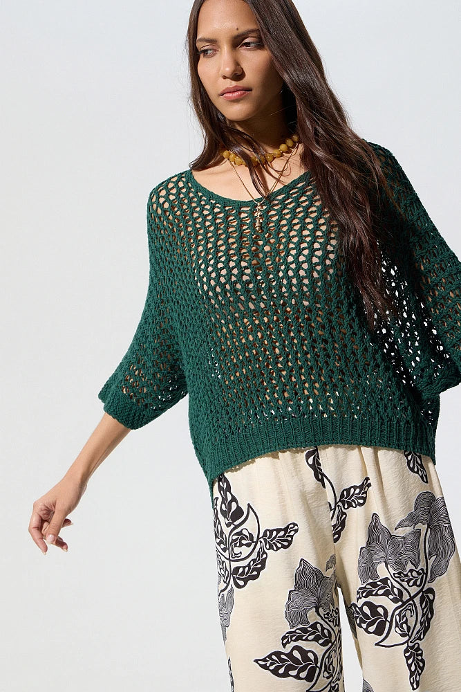 Pull à manches 3/4, col en V, en maille ajourée, coupe ample